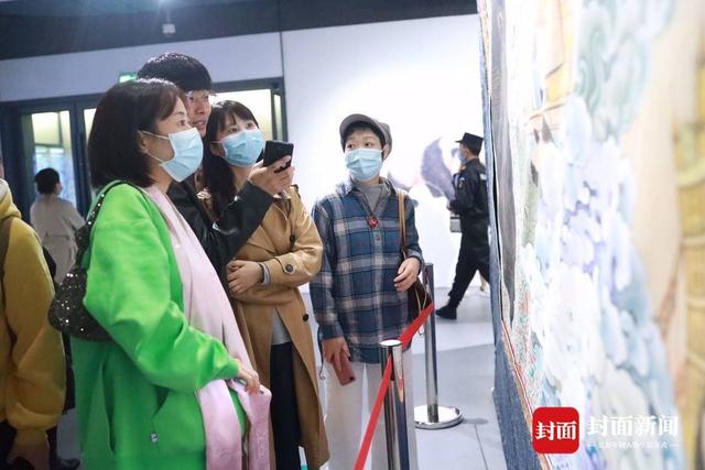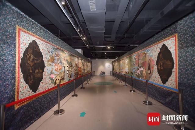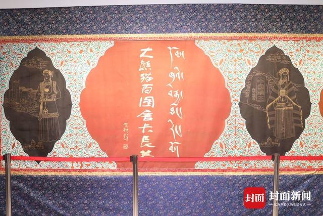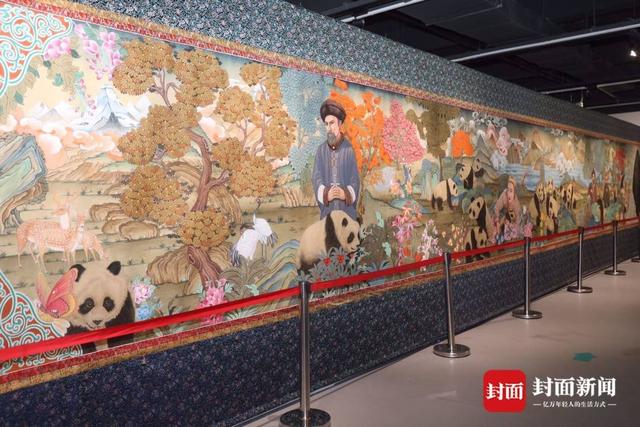 现场讲解人员介绍,作品总长172米、高2.6米,画心长142米、高1.6米,是迄今为止中国乃至世界以熊猫主题绘制的规模最大、长度最长、内容最丰富的唐卡巨作。标题“大熊猫百图唐卡长卷”由著名画家邱笑秋先生题写,题跋由著名作家、四川省作协主席阿来先生所写,均以红底贴金的传统红唐技法进行传神展现。