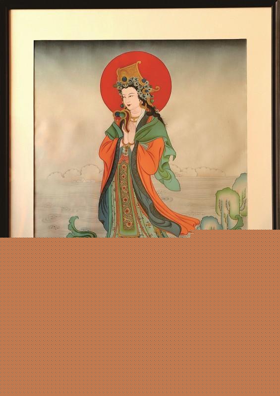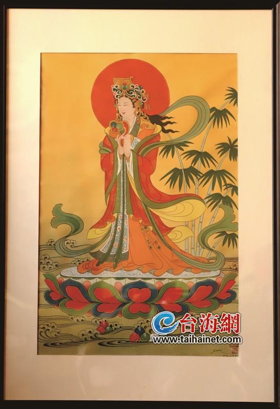 据了解,唐卡的绘制要求严苛、程序极为复杂,必须按照经书中的仪轨以及要求进行,包括绘前仪式、制作画布、构图起稿、着色染色、勾线定型、铺金描银、开眼、缝裱开光等一整套工艺程序。制作一幅唐卡用时较长,短则半年完成,长则十余年。唐卡《妈祖》是唐卡创作中的一次创新,它运用了西藏特殊的制作工艺,以艺术的形式传播妈祖文化,是闽藏文化的一次完美交融。