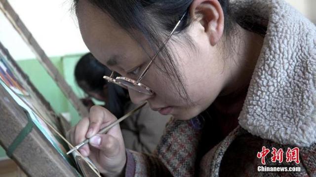 笔尖轻触,点画佛衣,不时拿笔蘸着颜料,眼前的唐卡度母画像已经耗时数十天,29岁的仁增旺姆还在继续创作这幅画。