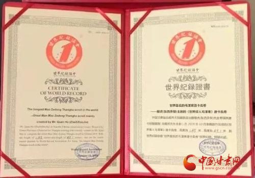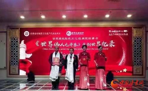 中国甘肃网12月20日讯(本网记者 张振国 文/图)武威市天祝县非物质文化遗产传承人扎西多杰,心怀红色文化情怀,八年如一日,创作的49.1米长卷唐卡《世界伟人毛泽东》于日前完成,该作品被世界纪录协会认证为“世界最长的毛泽东唐卡长卷”,作品引起国内文化界高度关注,数十家媒体争相报道。