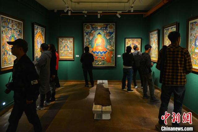 中新社记者在现场看到,展示的唐卡中多为传统勉唐派风格,也有创新的现代医生题材,以及使用丙烯作为颜料的唐卡。
