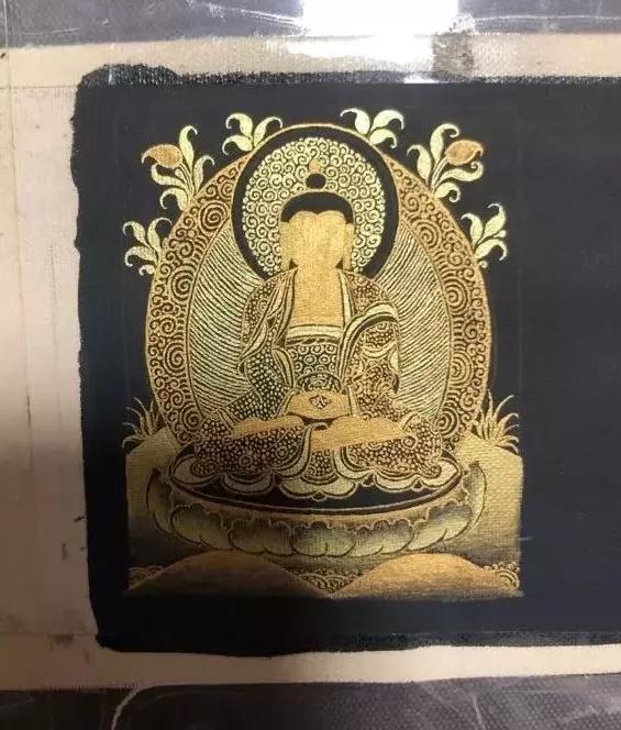 磨金则是在如佛像的冠冕等珍宝装饰、靠背上镶嵌的珠花边、宝物等处,用纯金的细粉末加水和骨胶调匀的汁液勾线,再经过打磨使其发光,这样整幅唐卡就变得金碧辉煌、光彩夺目了。