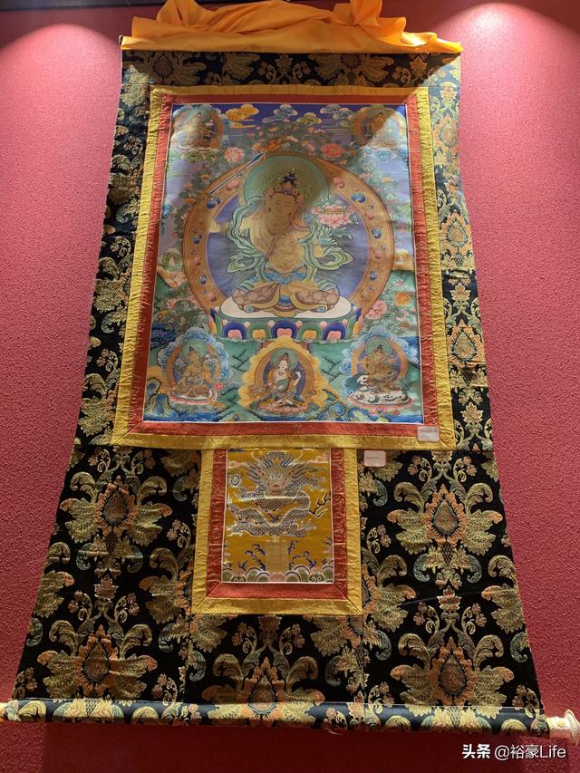 第八:唐卡装裱,把画布从框上取下来,请高僧在佛像的额、下巴等背面写下‘嗡阿卡’等真言,用各色绸缎做边装帧,然后送到寺庙内请高僧诵经,进行开光仪式,一幅唐卡才算完成。