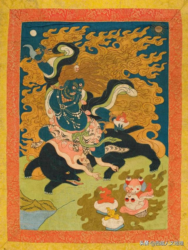 扎寺珍藏的这幅堆绣,主尊是护法神,蓝色身,三目圆睁,呈忿怒相。长发指天,发间有骷髅头,脖子上挂了一串粉色骷髅头,最令人惊奇之处,是骷髅头的造型比较写意,乍一看,像新鲜的草莓,也很有卡通的感觉。护法神,腰束虎皮裙,右手高举金刚杵,左手捧噶布拉碗,以人皮为坐垫,骑在威猛的神兽之上,火焰背光,英姿飒爽。看着画上清晰可见的针脚走向,心里不惊感叹,怎样的一双巧手才能制作出这样的精品啊!