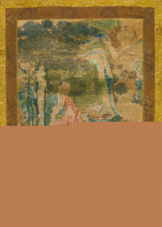 第一眼看上去,你会以为这是一幅明代的文人画,青蓝色基调,人物坐在树下,衣带轻飘,造型如禅宗高僧,山石背景恍如汉地。但它是一幅唐卡,展现藏密十六尊者之一,伐阇罗佛多尊者的唐卡。这是一幅汉藏艺术水乳交融的唐卡作品。