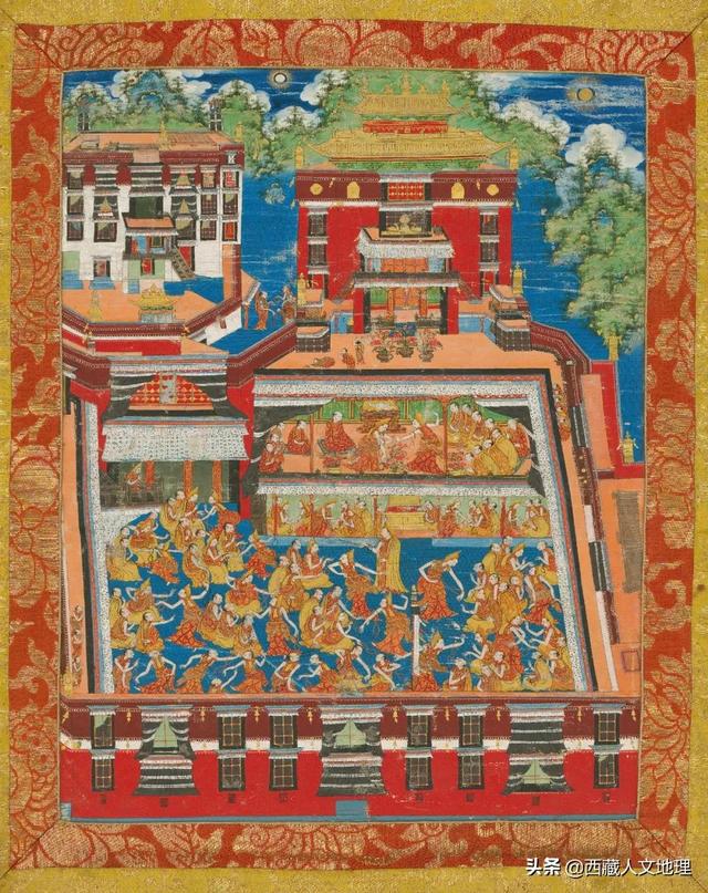 五世班禅时期的扎寺,由图可见,所绘建筑是班禅宫殿,措钦大殿,以及措钦大殿东侧的千佛廊院。唐卡的主体,并不是建筑本身,而是千佛院内正在辩经的众僧。辩经是藏传佛教文化中关于教义、伦理和现实的一种辩论交流,也是当地佛学院的必经学习阶段。虽然他们对宗教文化的理解和看法各不相同,不过精彩的辩经仍是特定语境中思想碰撞的绝佳途径。