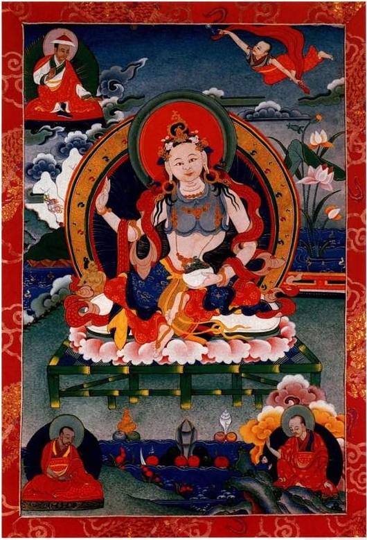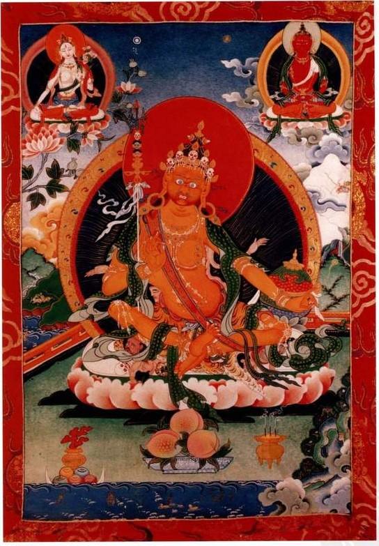 唐卡(Thang-ga)也叫唐嘎,是藏文音译,指宗教卷轴画。唐卡是一种藏传艺术的表达,他是藏传艺术的大百科全书,题材方面涉及了藏族的政治、历史、社会生活和文化等诸多领域。唐卡具有鲜明的藏族特点,唐卡有在丝绸上面刺绣图案、丝绸织唐卡、版画唐卡、绘制唐卡等多种制作方法。一般在唐卡的中心位置为主要人物,周围是和中心人物有关人物和故事场景。