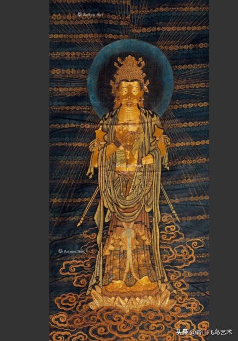 藏传佛教造像于6-7世纪出现了一种或立或坐姿的持莲花菩萨,其流行区域之广、延续时间之长,几乎在西藏的每一处寺院都可见到。蓝色锦地布满优昙钵华,此花意译灵瑞、瑞应。花隐于壶状凹陷之花托中,世称其花三千年一开,值轮王及佛出世方现,喻极为难得的不世出之物。如《法华经·方便品》云:“如是妙法,诸佛如来,时乃说之,如优昙钵华,时一现耳。”寓意湛然寂静、花雨漫天,为一切见闻者种无量褔德,同时暗寓此像示现时国泰民安、天地祥和。此幅作品造像姿态极为罕见,织、绣用料及工艺之精湛前所未见。钉金绣,又称金银绣;钉金绣针法复杂,有过桥、踏针、捞花瓣、垫地、凹针、累勾绣等60多种针法,其中“二针企鳞”针法为其他绣种所无。此幅作品充分运用垫、绣、拼、缀等高超技艺。有极其珍贵的收藏、艺术、宗教、历史价值,是一件难得一见的稀世珍品。