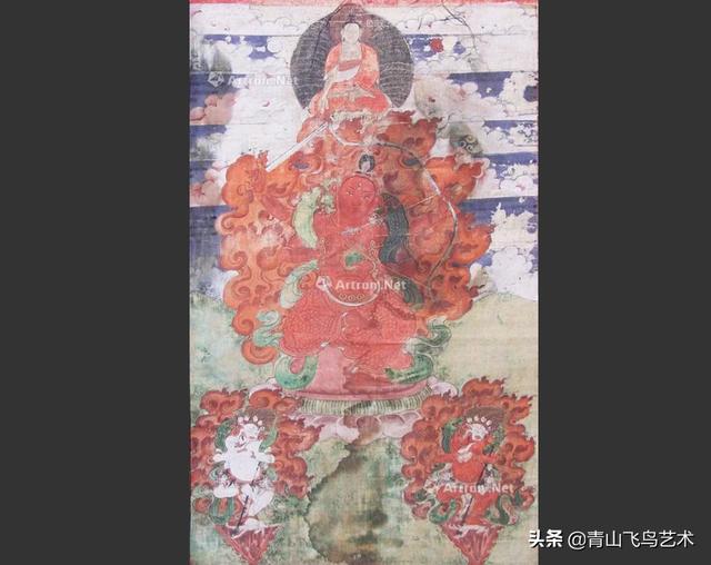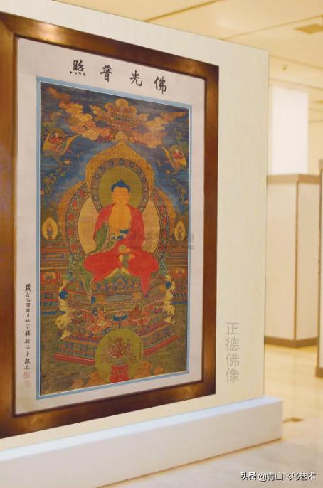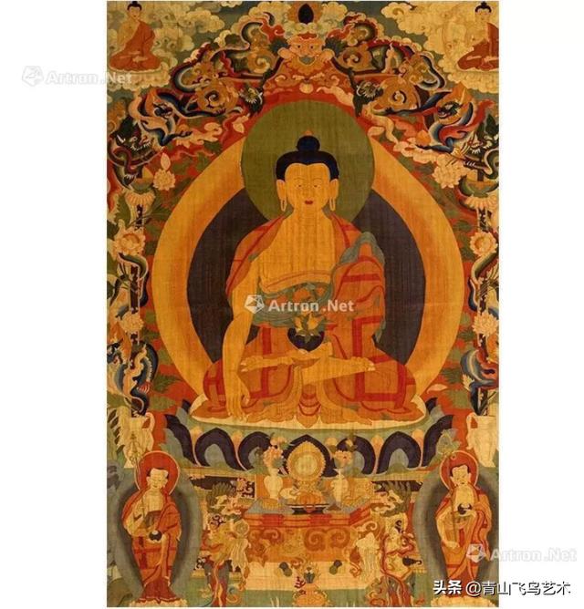 此件精美绝伦的佛像,画面右下方细微处以金彩落藏款“正德十二年六月二十日工笔,天灵寺记正,男齐伯祥室人斩氏”。为典型明朝正德时期宫廷之作。所绘药师佛又名药师如来。目为微睁状,左手托药钵,半跏趺坐于华丽的莲花宝座之上。头顶七彩祥云,周遍神将膜拜。这件佛像以稀有珍贵的植物及矿物颜料绘制而成,并施以金粉,色彩富丽沉稳,整幅画像用的是宫廷特有的细绢,制作极为讲究,色彩与绢相互匀染烘托出药师如来神圣的感觉,生意盎然。宫廷画师绘画功力深厚,绘制极其精细讲究,笔触沉着严谨、设色稳重,所绘佛祖面容端详、庄重传神,将无上神圣的感觉体现得淋漓尽致。佛教绘画作为宫廷绘画的一个重要组成部分,一直绽放着璀璨夺目的光彩。明朝时期,源于佛教艺术自身强烈的感染力,加上政治文化上佛儒思想的奉行,使得当时的佛教绘画吸引了大量文人士大夫画家的积极参与,发展空前繁荣,因此,千年来的佛画增添了更多的文人情怀与优雅气质。在此背景下,产生的明代宫廷佛画像最为显着的特点是繁缛细密、精益求精,庄严中散发着儒雅的气韵。庄严高深优雅的明代宫廷佛画,成为中国绘画史上最值得学者及藏友们关注和深入研究的艺术品之一。