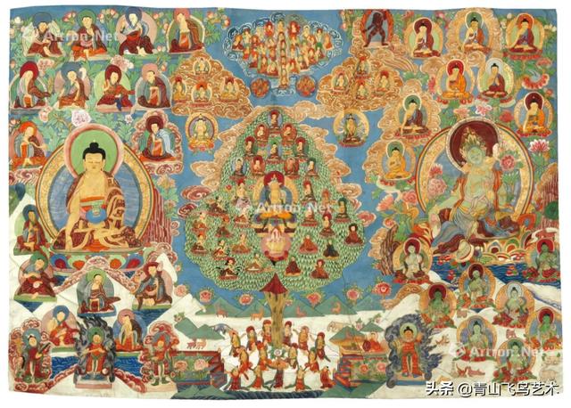 宗喀巴大师的平生,在学问修持各方面都具有很高的造诣。对于教理,他总结大小乘、显密一切教诫理论,而自成一家之言。他一方面有囊括大典、网罗众家的气度,一方面又以深刻谨严的态度执择佛教各宗的见地,以中观为正宗,以月称为依止。他对于戒律,能矫正旧派佛教的流弊。他所创的格鲁派至今为我国藏地第一大教派。藏语系统的佛教徒,大多崇奉他为教主。此组唐卡画面中央为神圣的宗喀巴大师,整组画面在施色方面有独特的讲究,重彩底色约分为红、黑、蓝、金、银多种,均为纯天然矿物颜料。红唐卡绘佛本生故事,画面风格颇显富贵。黑唐卡绘护法神、金刚一类镇妖降魔的内容,并施金色勾线,画面威严庄重。蓝唐卡则绘欢喜佛、胜乐金刚一类题材,有吉祥喜庆之美好寓意。此组唐卡大量使用了金银彩,画面富贵典雅,色彩金碧辉煌。画面底色还随“地界”至“天界”的内容变化而变化;到了天界,便是一片湛蓝的底色。此外,白色底被作为表现神佛容貌、性格的一种手段,因此常以白色表现平静、和蔼、善良;红色和深蓝色表现强悍好斗、凶猛狰狞(愤怒相),有的常常巧妙地把大块的红色、绿色、青色和蓝色并列使用;金色代表多种颜色,表现出一种神圣的气氛。整组画面富丽堂皇。从绘画上讲,不难看出功力深厚的画匠颇得工笔绘画的深邃,将黄教祖师佛—宗喀巴大师的无上神圣表现的淋漓尽致。其中更为精彩的是每一张唐卡在局部都有画匠用金彩书写的藏文故事,这更加体现出此组唐卡的神圣色彩!整组唐卡张张交相辉映,这种金绘唐卡难度极大,如此之精妙且成套者,极为罕见,15件成组保存完好,可谓藏传唐卡艺术中的神品!