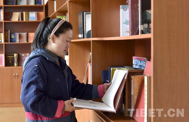 图为尼玛仓拉正在翻看书籍 摄影:王媛媛