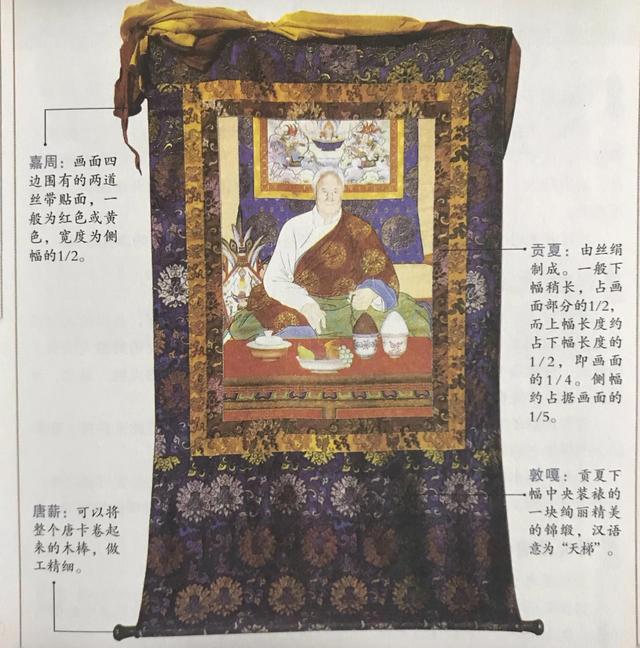 第7, 装裱。精品唐卡应当装裱完整,画面四周要缝裱被称为“贡夏”的丝绢、四周有两道被称曾“嘉周”的丝带贴面。有些唐卡在下幅中央还装裱有一块被称作“敦嘎”的精美锦缎。唐卡最下面还应有一个被称作“唐薪”的可以将整个唐卡卷起的木棒,木棒两端一般会分别套上一个金银或青铜制成的被称作“止朵”的盖。