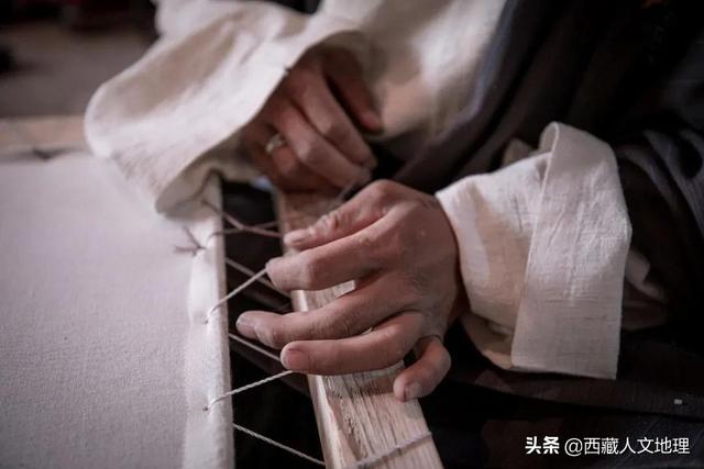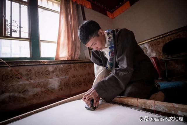 两层的教学楼里,每一个房间呈现出唐卡绘制的不同阶段。一楼尽头的是一个光线比较柔和的教室——刚入学的孩子在这里学习如何制作画布。“把白色的布用线缝在板子上,再用清水打磨,然后晒干。再刷上一层由胶和矿物颜料混合而成的白色液体,自然晾干后,又再用石头去打磨,整个流程大概需要15天左右。”唐卡学校的老师说。