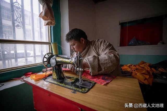 旁边的教室里,缝纫机、布料一应俱全。这里是完成一幅完整的唐卡需要做的最后一步——装裱。杰秀白嘎画派的特点之一就是装帧考究,画布周围边框材料的选择,以及唐卡上面盖布——布、丝绸、针线,以及牙条、颜色、布局等讲究搭配适宜,力图装帧的布和画完美地融为一体。“其实在知道画的尺寸之后,就可以根据画的风格和内容着手装裱了,可以和唐卡绘制同步进行。”工作人员解释道。