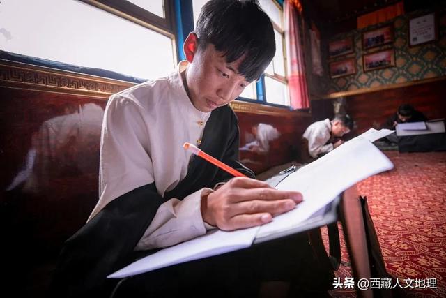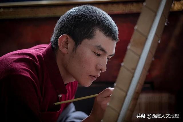 随后学生们就进入高级班,这个班的学生基本上学唐卡都在六七年以上了,他们可以自己独立完成一幅唐卡。学生们熟练地交换使用着粗细不一的画笔,灵巧地完成每一处转笔和运笔。再娴熟地用舌头舔过笔尖,岔开的毛立刻温顺地凑到一起,变成了完美的圆锥形……仿佛自动生成了一个结界,完全不受我们打扰,他们沉浸在自己笔尖的世界里。