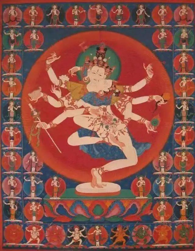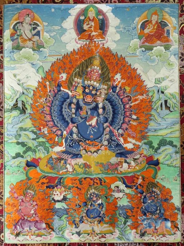 从上图也不难发现,钦则画派在构图上也是采用的中心构图法,主次分明,色彩上过渡色淡色少, 主色调多用重色晕染, 晕染方法都是湿烘方法,还善于使用对比色,配色细腻讲究,色彩沉着饱满,给人一种不能言语的舒适感。其实它还受到汉地的影响,选材增加了画面背景、山水、岩石... 但没有勉塘接受的汉地因素影响程度大。钦则画派更擅长绘制愤怒金刚,作品威严庄重...人物造型丰满,有阳刚之美。