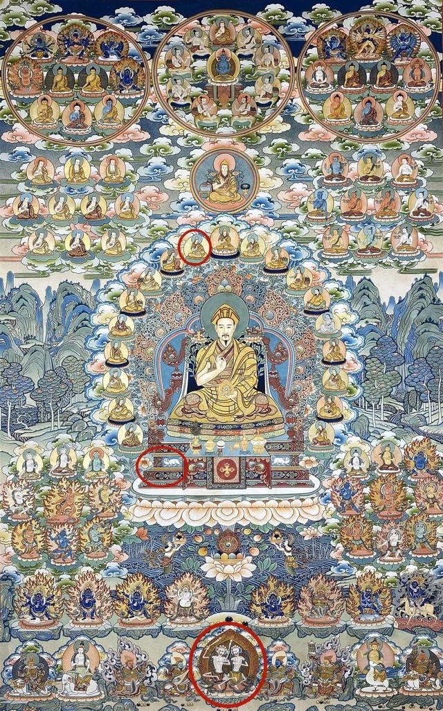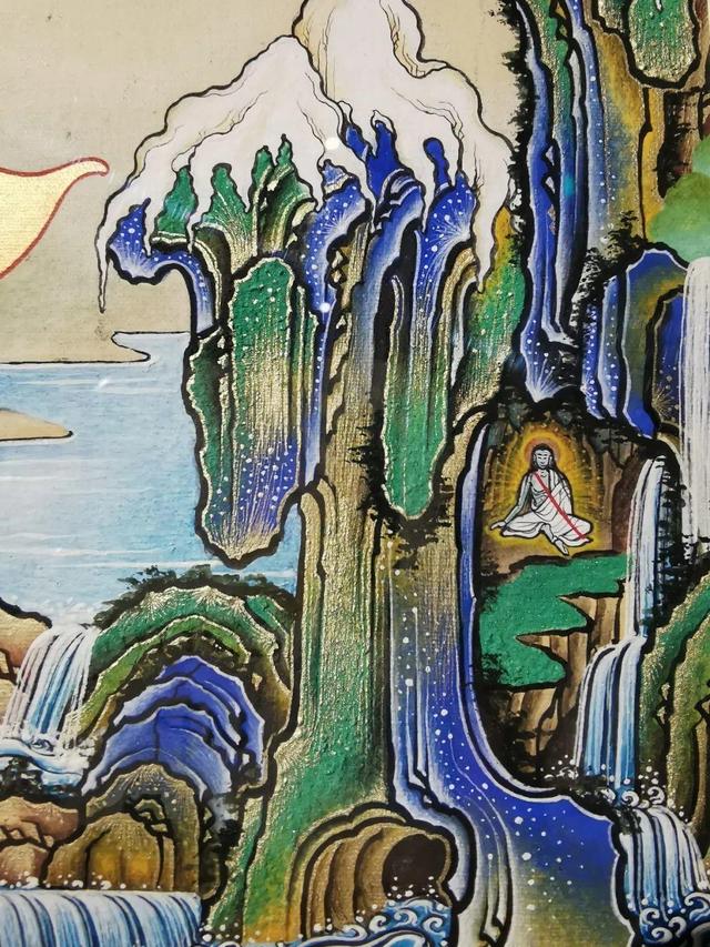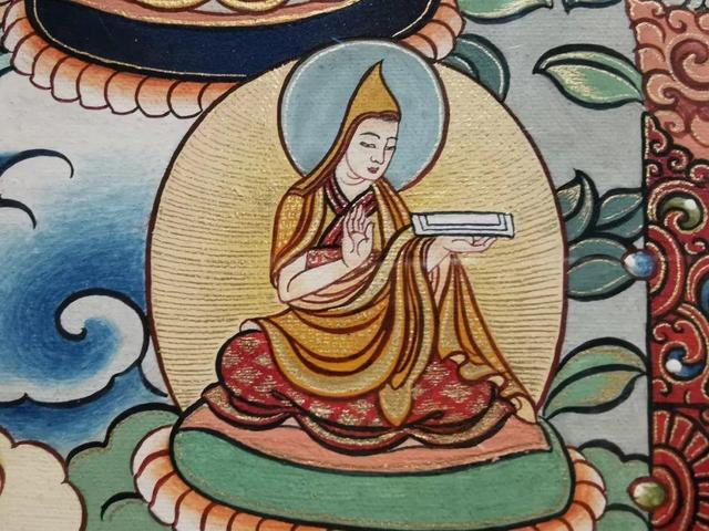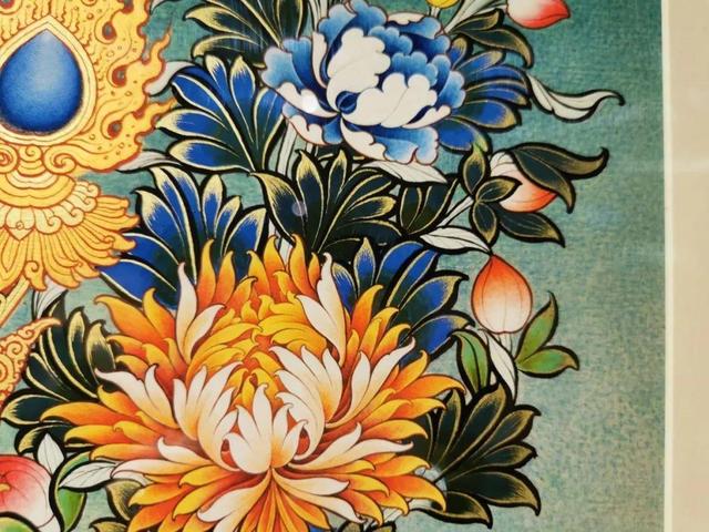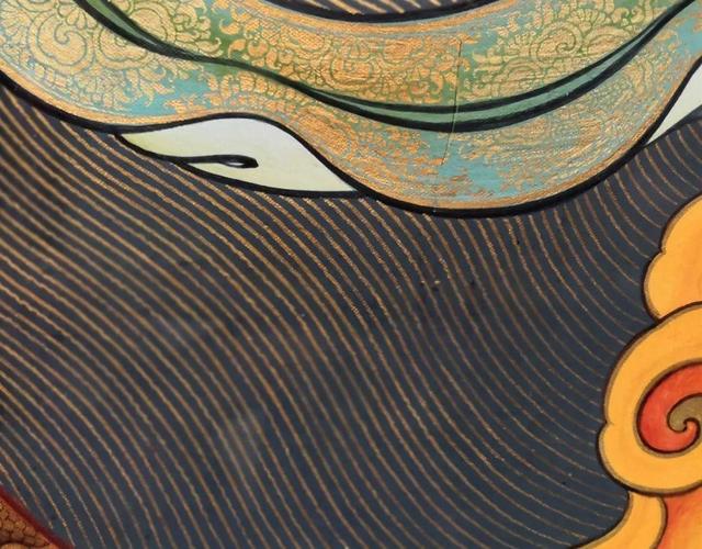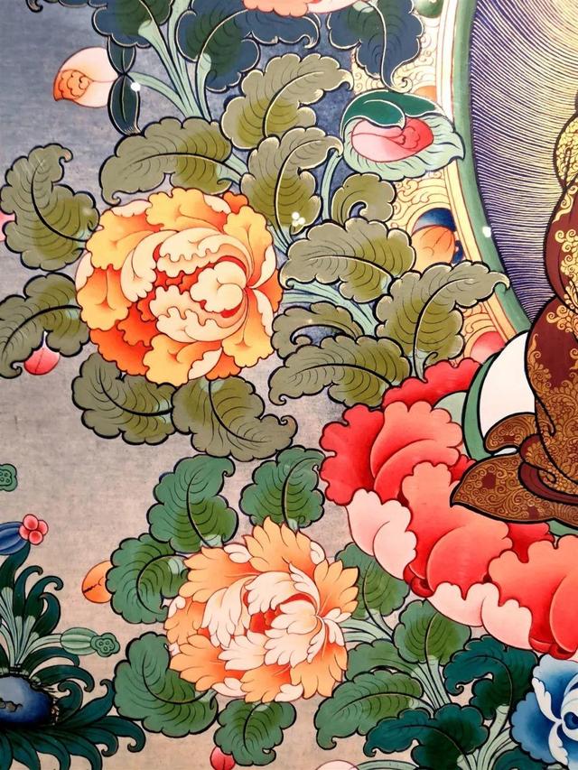 在造像之外,大到山水、云朵、花卉,小到造像的背光、衣服的纹饰,都是唐卡画师可以自由发挥的地方,也是唐卡艺术性的主要体现。