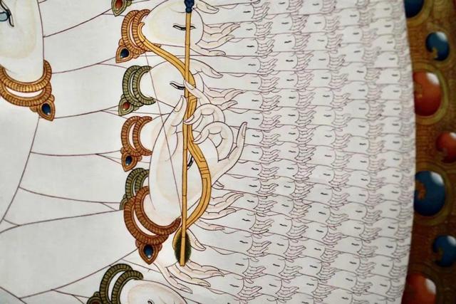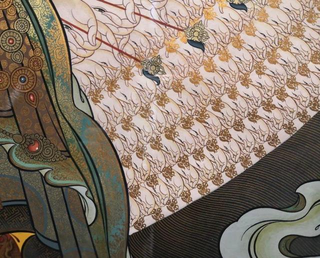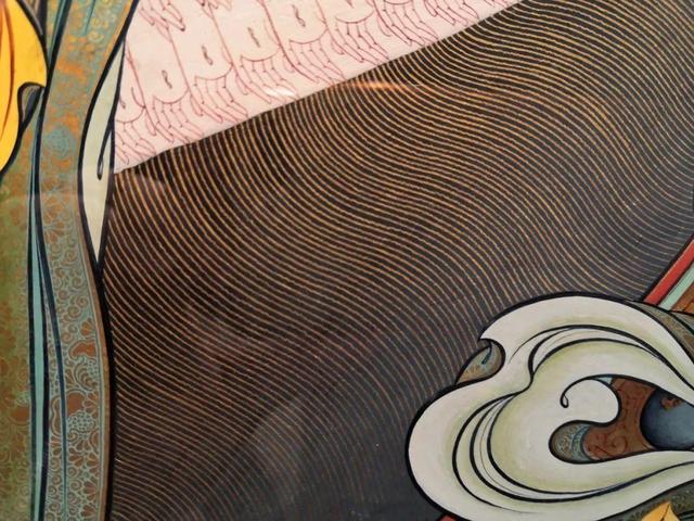 本次展出的唐卡,在描绘这些部分时,无论是线条的运用,还是色彩的晕染都突破了传统手法,呈现出工笔画和当代绘画的特征,可以说是唐卡艺术审美上的创新。