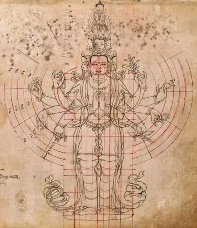 唐卡的核心元素是佛、菩萨造像,而这些造像的身体尺寸、比列、位置、甚至姿势都有严格的规定。