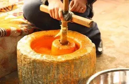 白色从高岭土提炼出来,石黄从雌黄提炼出来,大红色是从朱砂里提出来,藏青色从孔雀石里提出来的石绿和蓝铜矿生出。有些矿物颜料的加工工艺极其复杂,以藏青色举例,首先要进行筛选和初加工,然后将初加工后的颜粉适量放入宽底石臼中,注入一定比例的清水反复研磨。这样的过程可不是一下午就能完成的,而是要历时五六天。然后再沉淀分层分离。操作这一步时,没有标准可循,全凭经验丰富、技艺娴熟的技师们通过眼力和手感来区分出头青、二青、三青、四青和头绿、二绿、三绿。这些层次因为粉末颗粒的粗细不同,在颜色上也是有深浅变化的。