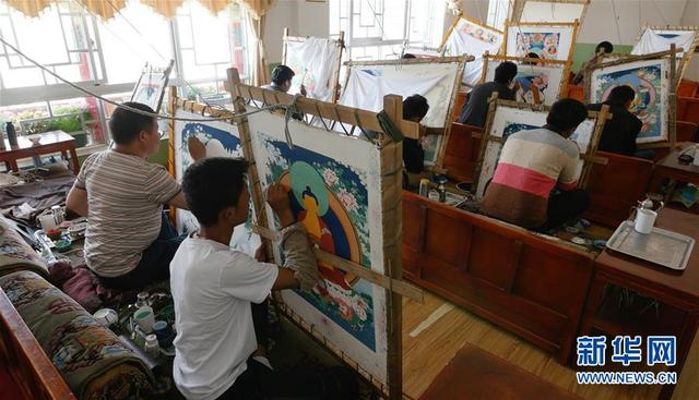 罗布斯达创办的西藏唐卡画院高级班学生在画唐卡(5月24日摄)。