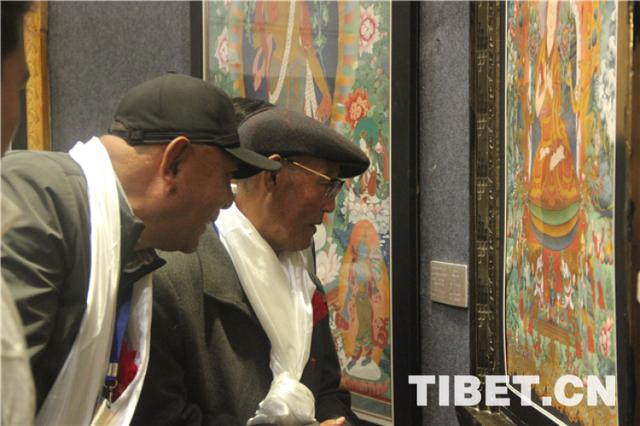 第四届中国国际唐卡艺术节在“中国唐卡之都”西藏拉萨开幕。 何蓬磊 摄 开幕式上西藏文化发展促进会授予国家级非物质文化遗产唐卡艺术代表性传承人丹巴绕旦、嘎玛德勒2位唐卡艺术大师“终身成就奖”。 何蓬磊 摄 图为与会人员参观艺术节唐卡精品展。 何蓬磊