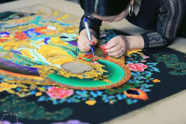传统唐卡的绘制要求严苛、程序极为复杂。着色染色、勾线定型、铺金描银...每一道工序都太细致,很费眼睛。