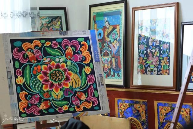 告别张丰捷,我们又拜访了另一个湟中农民画家韩老师。一间采光极好的大画室,墙上展示了韩老师的很多作品。