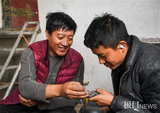 走进土登江措家的黑玉石雕工作室,极目新闻记者看到,几名年轻的学徒正在进行黑玉雕刻。