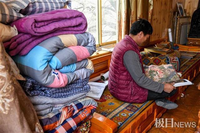 在土登江措的家庭艺术工作室,有一间房屋里围坐着三名学徒,正在赶制一批唐卡。
