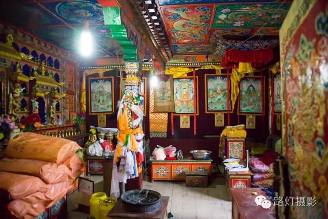 在另一间房里,别有洞天,供着佛龛,周边的藏柜上供着各种经书,墙上挂满了色彩不一的唐嘎,有的已有上百年的历史。这不像佛堂,倒像一间微缩的唐卡博物馆。