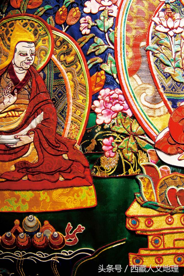而在敦煌出土的文物中,也发现过运用堆绣手法制成的宗教唐卡画卷。在藏地古老宗教苯教的经文记载中,其创始人登巴辛绕米沃在万千年前曾将众多技艺传授给包括藏地的诸多地域的学者,其中在“bZo rig p’i skor”这卷经文中便记载了如雕刻,绘画,堆绣,坛城建立方法等一系列的技艺。这从另一面旁证了藏族堆绣工艺的悠久。