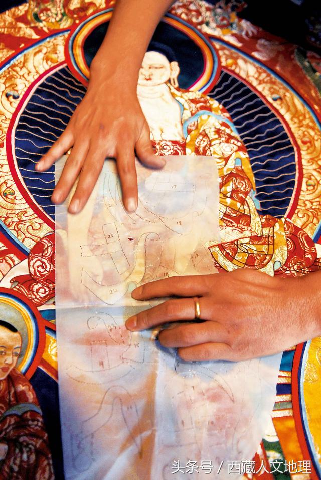 尼玛今年50多岁,有着优雅白皙的面容,她是如今拉萨已经为数不多的懂得堆绣技艺的技师。作为家中的长女,尼玛无法像弟弟妹妹们一样去上学念书,一直照顾家中大小事项并继承了曾经是哲蚌寺技师的父亲的堆绣手艺。尼玛从12岁时便跟着父亲学习堆绣,花费了10年时间,到了20多岁才算是可以出师,被允许去独立绘绣一幅唐卡。