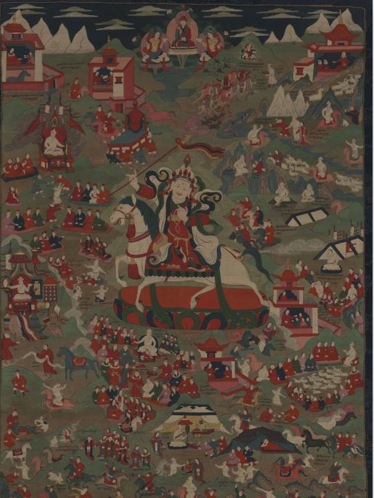 四川博物院藏的11幅唐卡,分别展示着围绕格萨尔王故事的11个人物,数百个故事场景被巧妙地安排在一套唐卡中。在人物四周配以相关的故事情节,以神子诞生显示神通、赛马称王降妖伏魔、铁马金戈南征北战、安定三界重返天国为线索,11幅唐卡完整地描绘了格萨尔波澜壮阔的一生,形象生动地再现了《格萨尔王传》中的精彩场面。