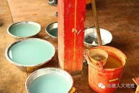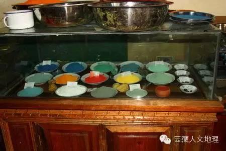 主要颜料原始产地:藏青、石绿产于尼木和甲绒,白粉大多来自后藏仁布地区和羊八井地区,山南洛扎和后藏是出朱砂的地方,云母是山南乃东的,墨色原料是林芝的,胭脂是门隅的,花青还是外国来的——不丹,不过察隅地区也有。