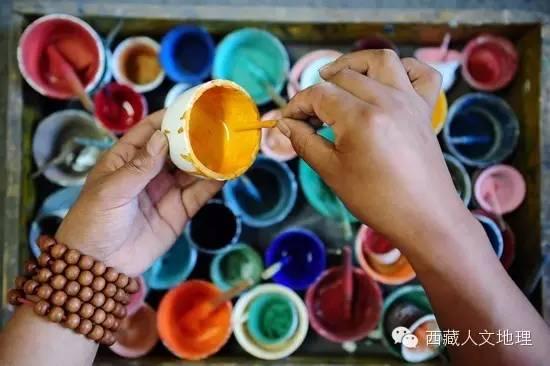 雌黄、雄黄、白粉需要“壮汉”来磨,藏青、石绿、朱砂则需要“病妇”来磨,因为要软磨、细磨;这是流传很广的藏族谚语。