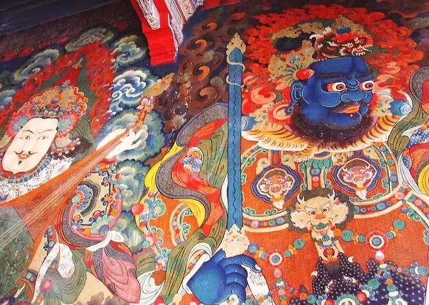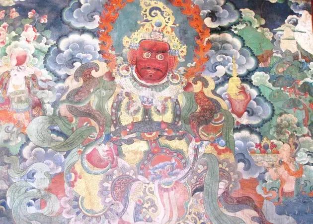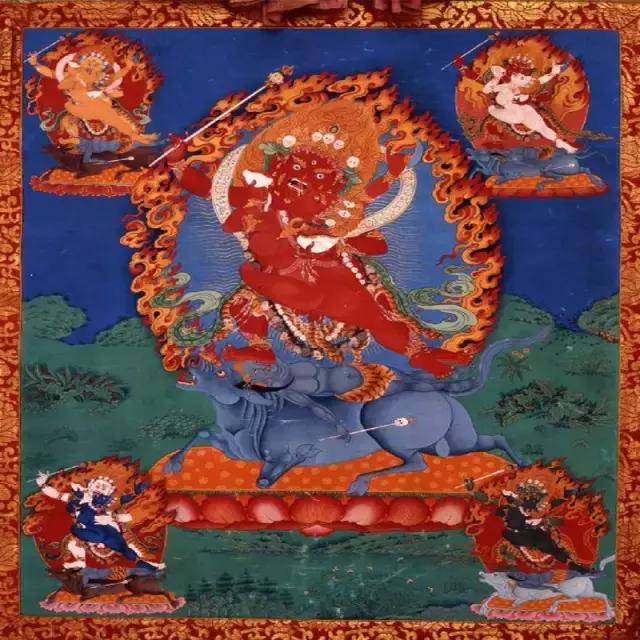 主尊像红阎魔敌,系佛教无上密乘一本尊,头戴五骷髅冠,三只眼,头发直立,饰有表示愤怒的火焰,他的右手捧一根象征“作恶者”骨架的人头棒、左手捧一个盛血脑的颅骨碗,双脚踩在一头水牛身上,右腿屈踏在水牛头以降伏水牛的傲慢,左腿伸踏在水牛臀部,从降服它的残暴。系钦孜画派风格。