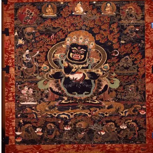 宝帐怙主为藏传佛教萨迦派传承的重要护法,自元朝以后在中原内地的蒙古地区深受其影响。宝帐怙主一面两臂,头戴五骷髅冠,三目圆鼓,面相狰狞,呈忿怒状,他腕托一根木挺杖,右手持金刚钺刀,左手托盛满鲜血的嘎巴拉碗。
