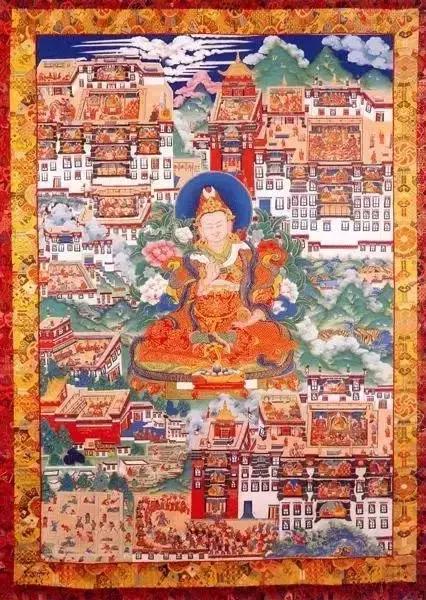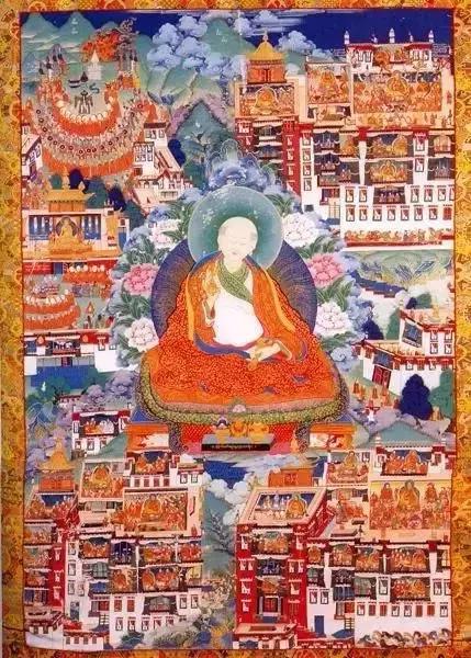 萨迦.贡嘎宁布(清代——布画),此图系观世音本生传记之一,中心人物为藏传佛教萨迦派五大祖师之一萨迦.贡嘎宁布,四周是布达拉白宫之建筑风貌,17世纪系门唐派作品。