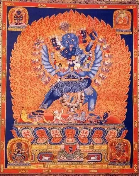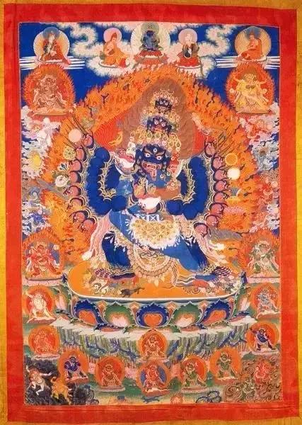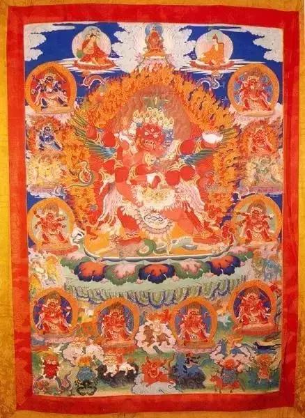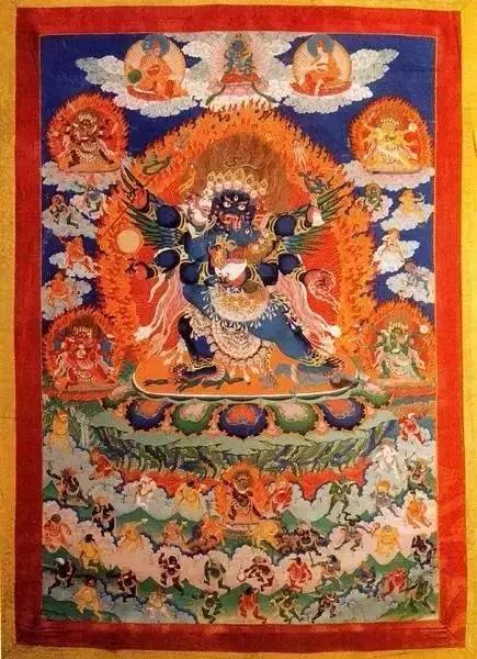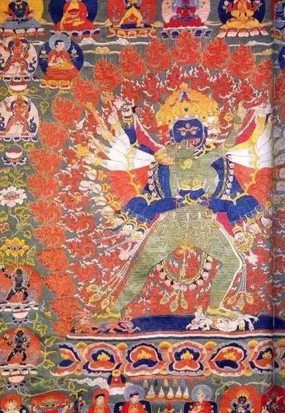 真实意(清代——布画),真实意本尊为八大法行中出世五法行之一,四周被真实意众神围绕,17世纪系钦孜派画作。