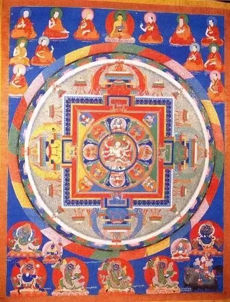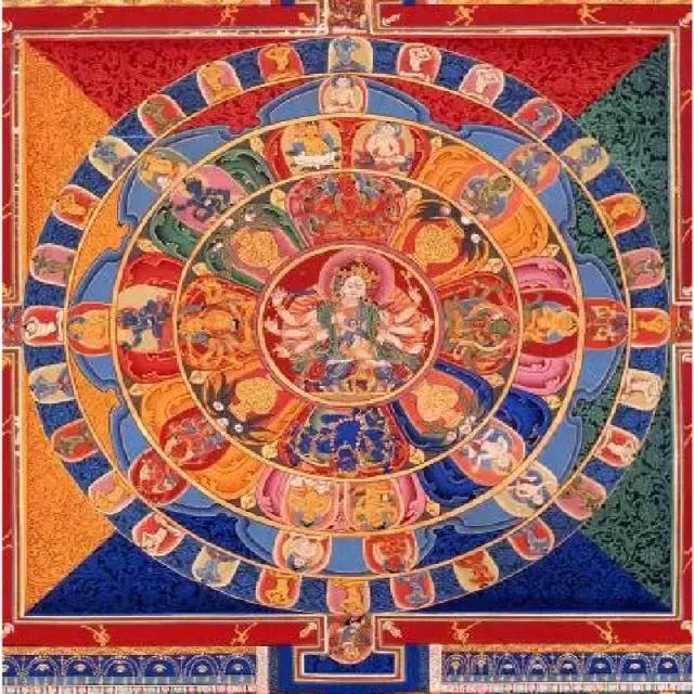 坛城源于印度佛教密宗,指一切圣贤,一切公德的聚集之处。坛城唐卡是一种以几何图形为主的构图,坛城是指佛的宫殿,由外到内以圆形和几何体形式层层相套构成,正中间为主尊或佛,外面图形以水图案及火焰图案装饰,第二层起用圆形的金刚图案、水图案、莲花图案装饰,表示大海、风墙、火墙和金刚墙、莲花墙、护城河。内套正方形图案表示城墙、屋檐,层层深入,最后到达主尊殿,并用红、黄、白、蓝表示东南西北四方,图案结构复杂,抽象和具象手法并用。坛城的构图紧凑,图案繁复多变,装饰性强,具有很美的形式感。