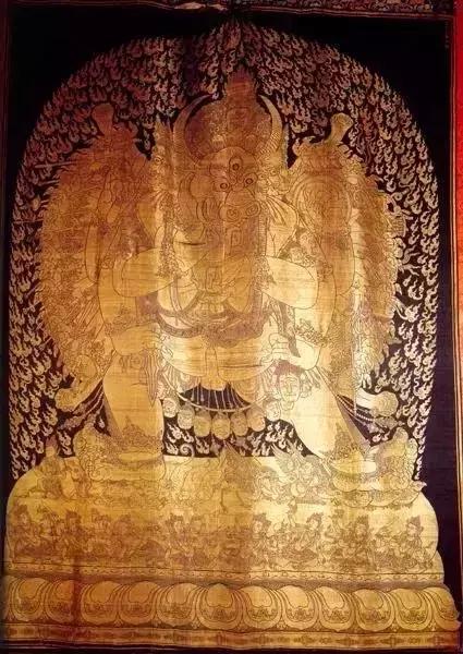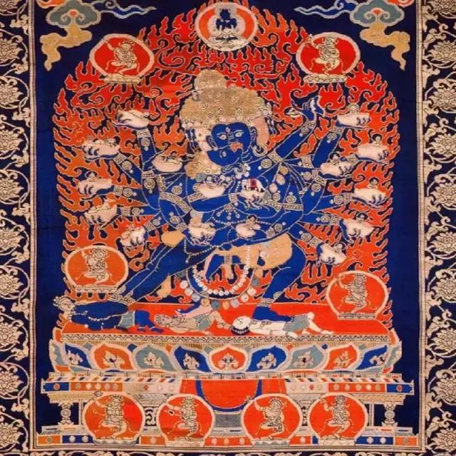 独雄大威德金刚(明代——金丝织),为密宗无上部本尊,为宗喀巴大师所修特殊本尊,14世纪作品。