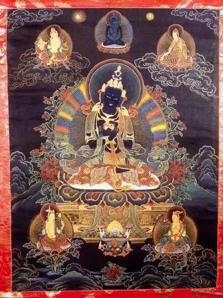金刚持(清代——布画),一切部主金刚持身为蓝色,手持铃、杵,其上方为法身、报身、化身相,下方为弥勒、文殊等所围绕。