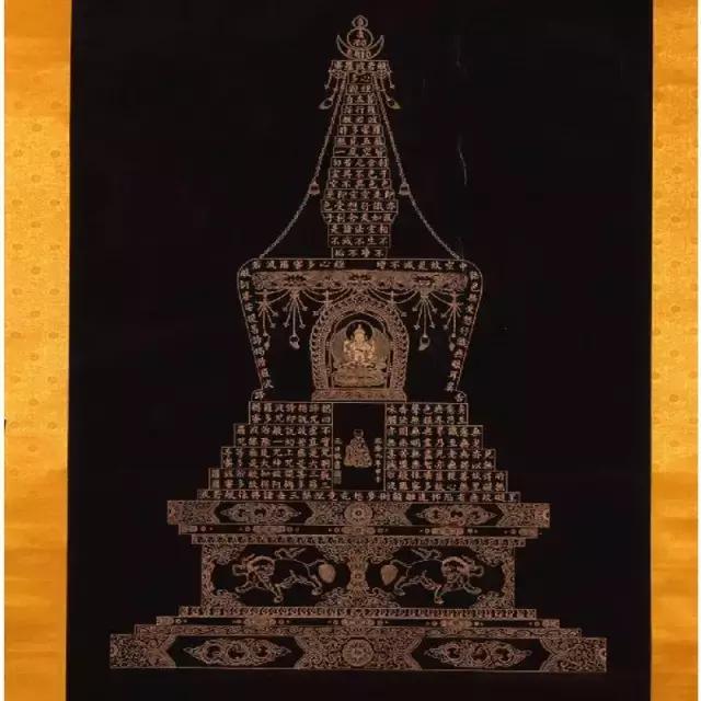这是一座菩提塔,塔的宝珠顶,日月上写有梵文兰扎体经咒,宝盖至塔座以上写有般若波罗密多心经。塔瓶中央绘有般若佛母,四级塔身的正中央有一位背对着的禅修者,其左右写有纪年题款“乾隆九年甲子之日敬书”。