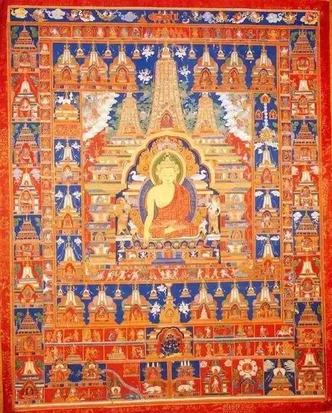 贝丹哲蚌大塔(清代——布画),在印度的庄严吉祥聚米塔内,释迦牟尼佛着受用报身之装束,讲授时轮本尊续,17世纪作品。