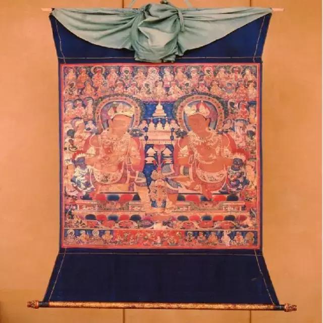 此幅唐卡为尼泊尔画派风格。强巴即为弥勒意为慈氏。佛教经卷记述弥勒将继承释迦牟尼佛为未来佛。文殊菩萨又称智慧菩萨,剑和经书是文殊菩萨的手持物,象征文殊的智慧如韧剑,可摧毁愚痴,般若智慧浩瀚如经卷。