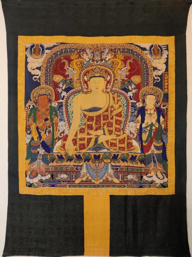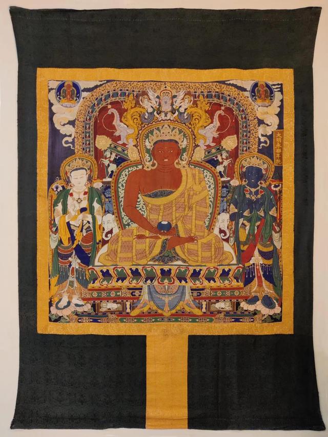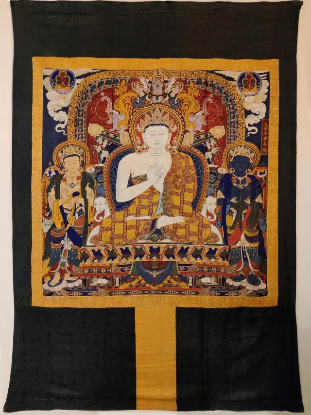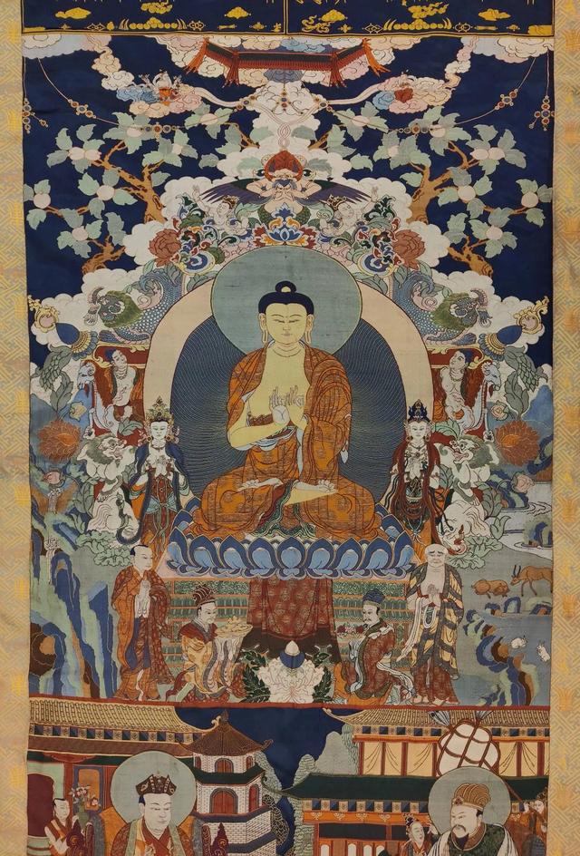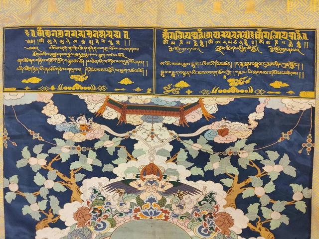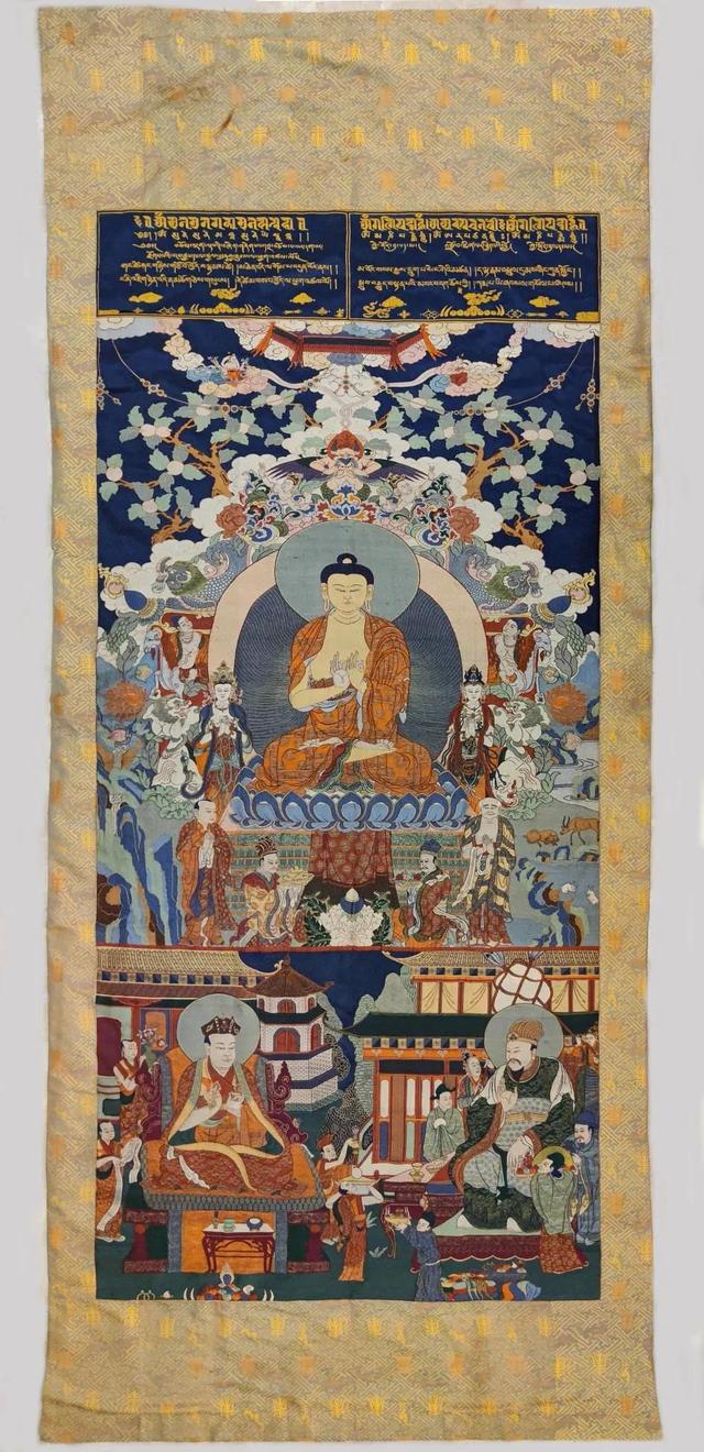 明代,织锦噶玛巴和明永乐皇帝学经唐卡,尺寸:275×115cm,此唐卡绣制极其精美,以噶玛巴和明永乐皇帝学经为塑造题材,左下角为噶举派噶玛巴活佛,右下角为明代永乐皇帝,人物刻画传神,动作表情自然,场景细腻,整体做工规整,绣工细腻,构图饱满,设色典雅,是一件较为高级的收藏佳品。