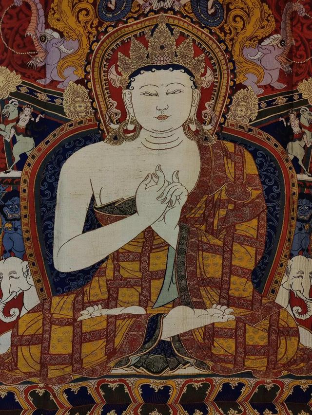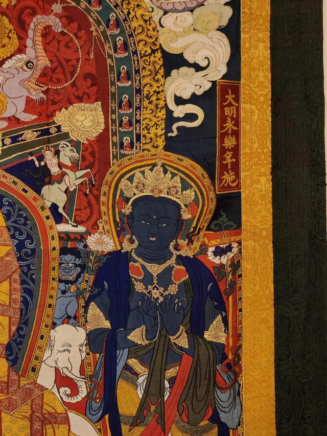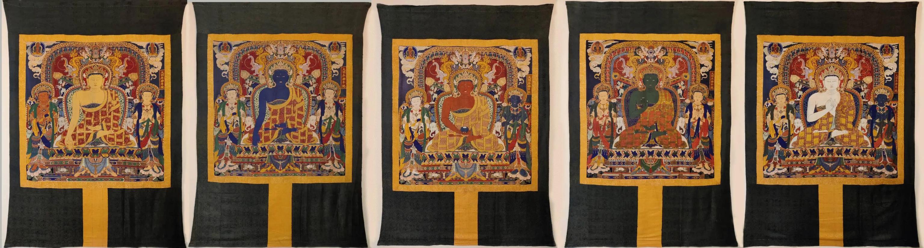 明永乐,云锦五方佛唐卡一套,尺寸:220×152cm每幅,云锦以用料考究、织工精细、典雅富丽、宛若流云而著名,其织造工艺极其复杂,运用了“通经断纬”等核心技术,至今无法用现代机器来替代。此套藏品为云锦织造五方佛坐像,“五方佛”,又称"五智佛"、“五方如来”、“五智如来”,源自密宗金刚界思想,东南西北中五方,各有一佛主持。分别是中央的毗卢遮那佛(大日如来)、东方阿閦佛(不动如来)、西方阿弥陀佛、南方宝生佛、北方不空成就佛,佛像开脸饱满,法相端严,神态慈祥,五官刻画细腻,弯眉长目,大耳垂肩,身着天衣,衣纹处理流畅自然,双手结印或托法器,呈全跏跌坐,此套制品构图巧妙,布局严谨,工艺精致细腻,一丝不苟。图案色彩繁多,细部极为繁复精致,十分华丽富贵,其工艺价值和艺术价值巨大。