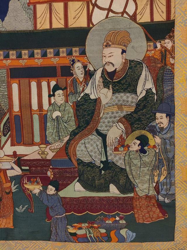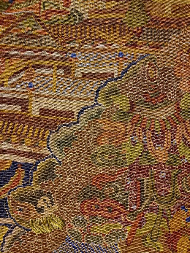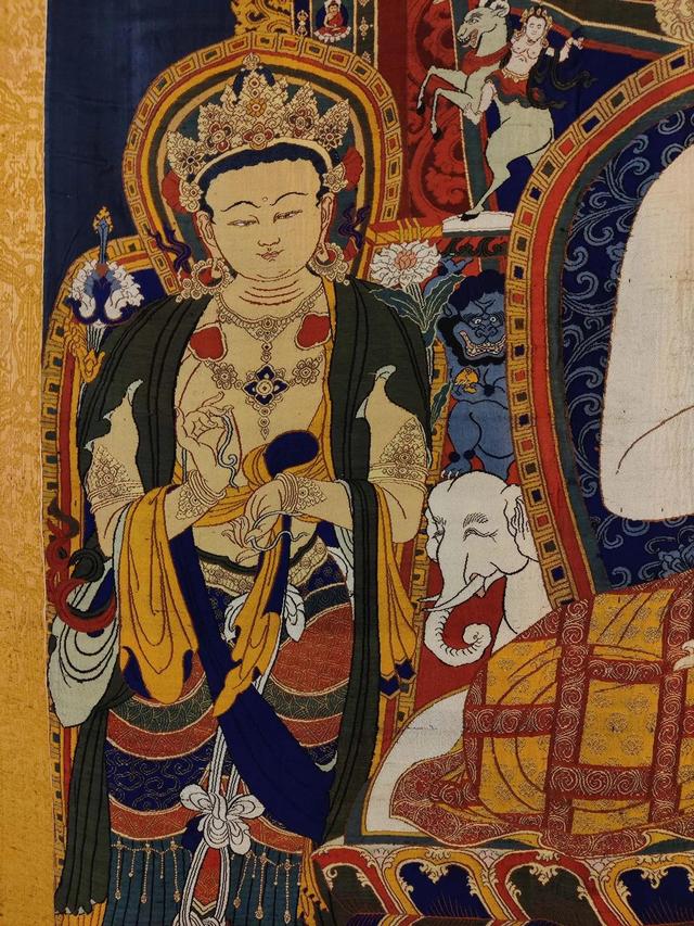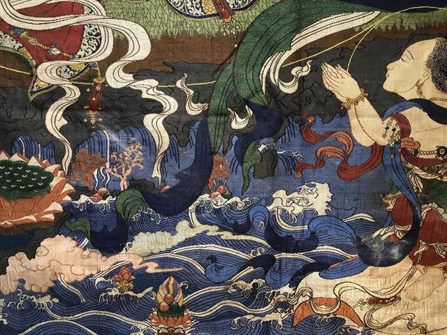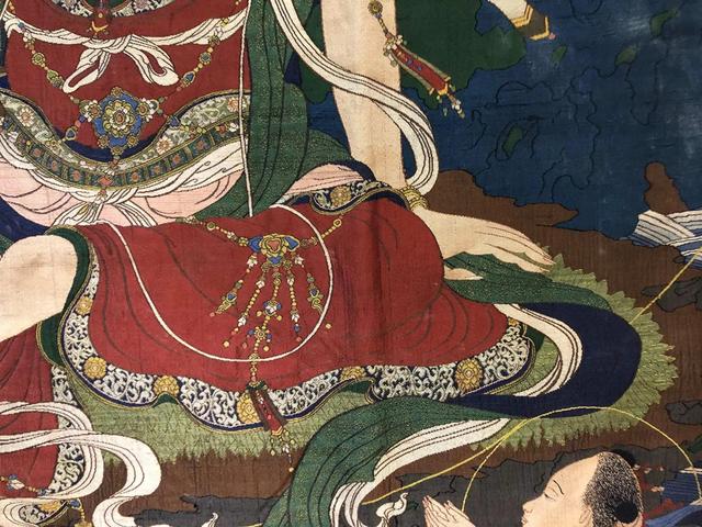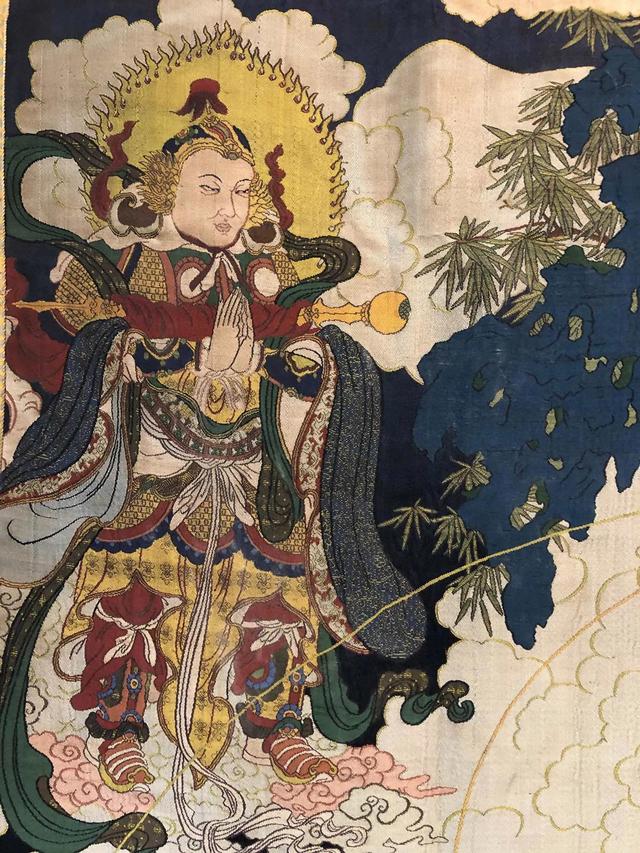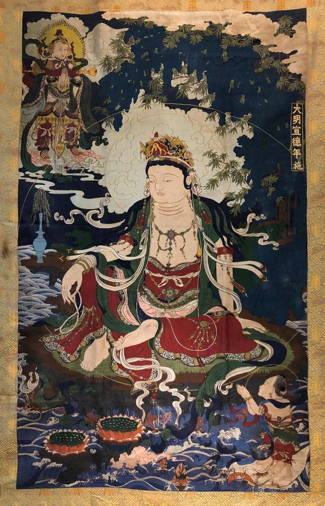 明宣德,云锦水月观音唐卡,尺寸:230×112cm,云锦以用料考究、织工精细、典雅富丽、宛若流云而著名,其织造工艺极其复杂,运用了“通经断纬”等核心技术,至今无法用现代机器来替代。此件藏品为云锦织造水月观音坐像,观音开脸饱满,法相端严,神态慈祥,五官刻画细腻,弯眉长目,大耳垂肩,胸佩璎珞,身着天衣,衣纹处理流畅自然,呈自在坐姿,此幅制品构图巧妙,布局严谨,工艺精致细腻,一丝不苟。图案色彩繁多,细部极为繁复精致,十分华丽富贵,其工艺价值和艺术价值巨大。