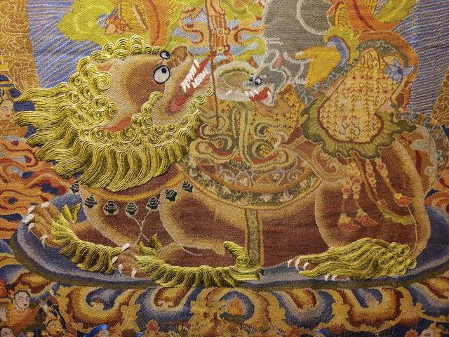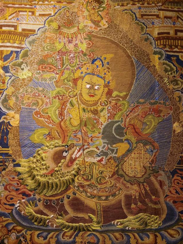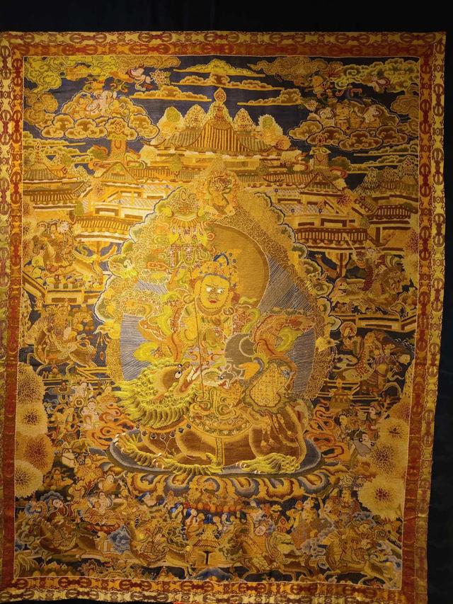 清代,纳纱绣财宝天王唐卡,尺寸:外边207×123cm,画芯128×96cm,此唐卡纱地上彩绣财宝天王,财宝天王头戴宝冠,阔面大耳,眉头微蹙,嗔目远眺。一手持宝伞,一手握吐宝鼠,手型饱满有力,形态逼真。天王作武将装束,身着铠甲,雄狮作怒吼状,四蹄和尾部壮硕,膛眉阔目,形象生动,狮卧莲座,此幅制品构图巧妙,布局严谨,工艺精致细腻,一丝不苟。图案色彩繁多,细部极为繁复精致,十分华丽富贵,其工艺价值和艺术价值巨大。